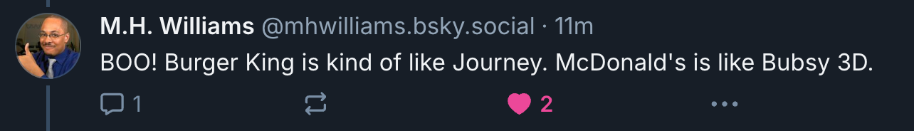 mike (who i worked with at fanbyte and is a legend) said that burger king (the fast food establishment) is kinda like the hit 2012 video game journey.